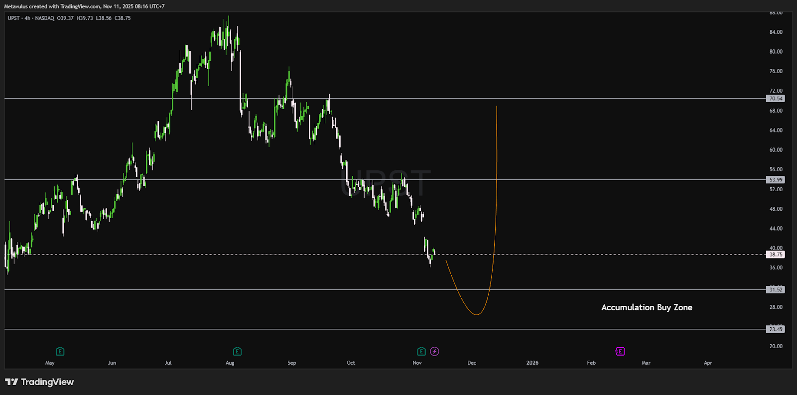 UPST berada di persimpangan valuasi menarik + narasi hati-hati. Jika perusahaan berhasil menjaga pertumbuhan >30%, menormalisasi margin, dan mengalihkan pendanaan kembali ke pihak ketiga, potensi rerating ke 4–5x sales terbuka. Dengan entry disiplin di $31–23.5, profil risk/reward condong positif untuk swing menengah.
